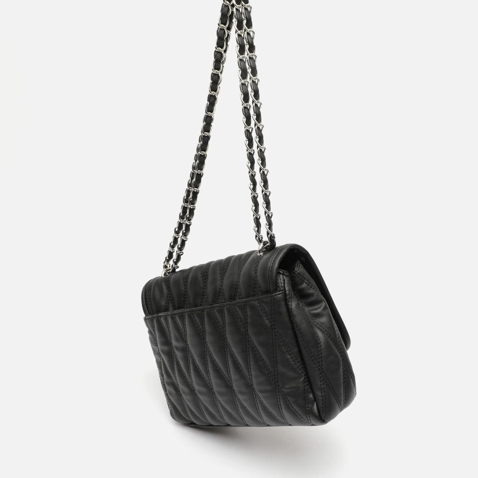 Su cadena doble entrelazada con tiras de polipiel permite llevarlo al hombro, cruzado o como clutch. Los eslabones metálicos en acabado plateado añaden un toque de brillo que realza tu look de forma natural.