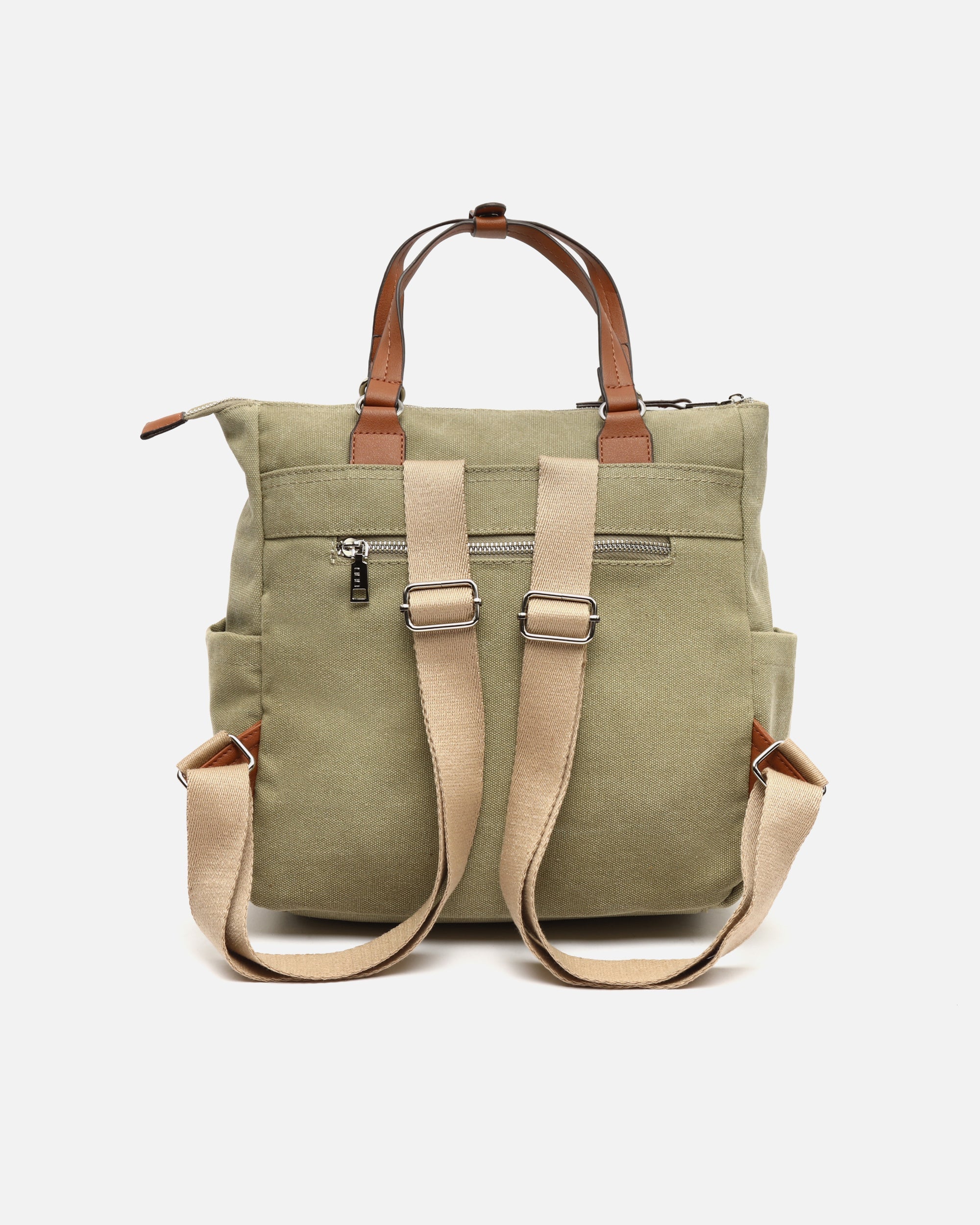 Está fabricada en algodón resistente y fácil de limpiar, con detalles en efecto piel que le aportan un toque elegante. Cuenta con un cierre superior de cremallera metálica, bolsillos exteriores también con cremallera, laterales para botellas y un asa corta que te permite llevarla también en la mano. Su diseño estructurado y compacto es perfecto para llevar lo esencial de forma organizada.
